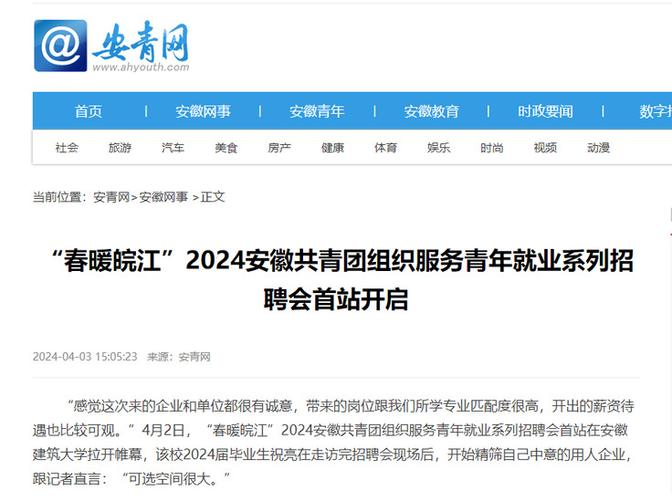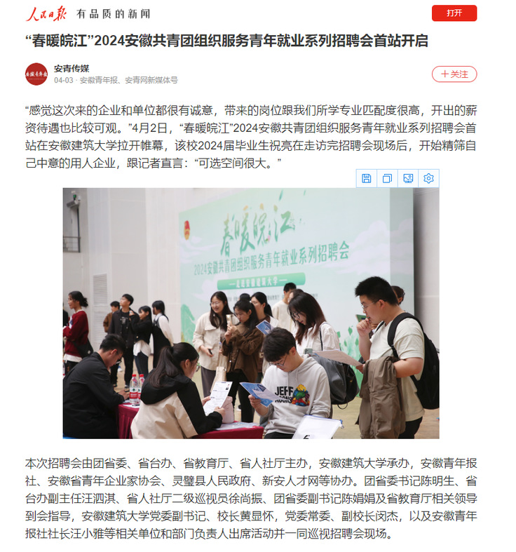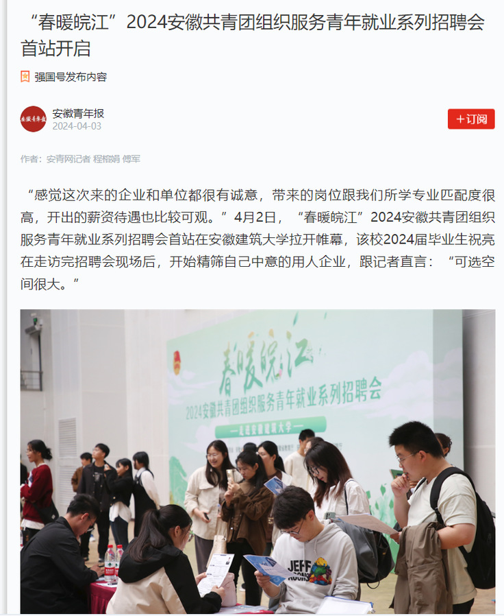 编者按:4月2日,“春暖皖江”2024安徽共青团组织服务青年就业系列招聘会首站在安徽建筑大学拉开帷幕。本次招聘会遴选了中建五局、中建七局、皖北煤电集团等近150余家优质企业参与,涵盖建筑业、制造业、互联网、电子通信、中文传媒、经济管理等20余个行业,提供对口就业岗位2500余个,2000余名大学生进场应聘。人民日报、学习强国、安青网等媒体对此进行报道。