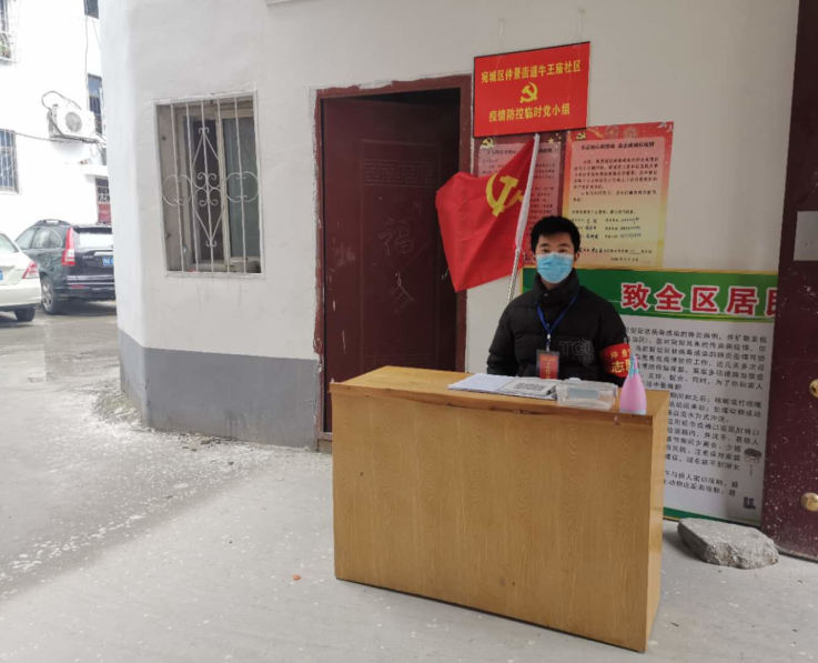 周金虎,艺术学院18级环艺3班,家在河南省南阳市宛城区仲景街道牛王庙社区,负责配合社区工作者对小区家属院进出人员进行登统计及其他工作;毛新,经管学院17级工程管理1班,家在内蒙古自治区阿拉善盟阿拉善左旗嘉尔嘎勒赛汉镇查汗高勒嘎查村,负责出入人员登记,排查有无身体异样,排查过往车辆是否有外来人员输入。