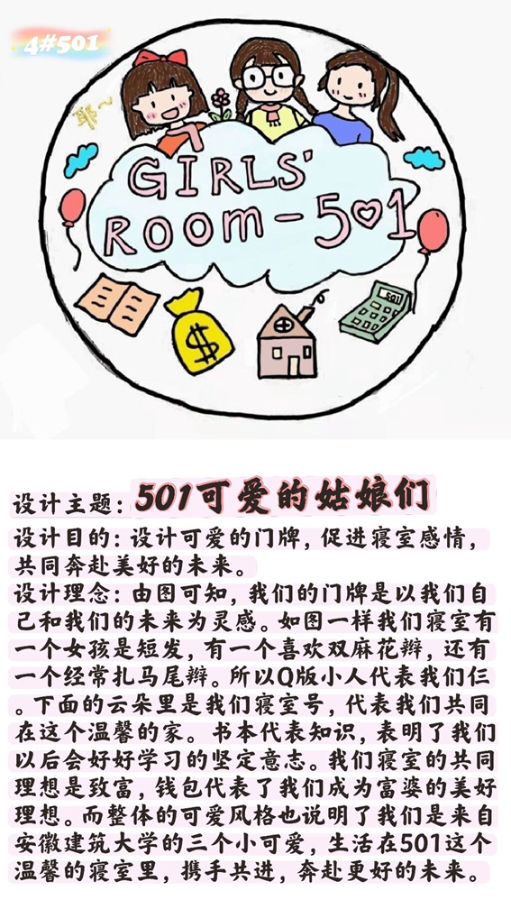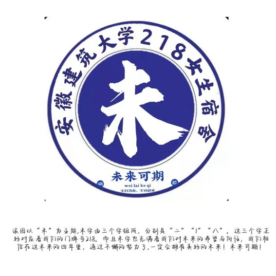 同学们设计的门牌中既包含“春秋早晚,岁岁欢愉”的平凡期望,也蕴藏着“金鳞岂是池中物,一遇风雨便化龙”的鸿鹄之志。9#218的四位女生更是通过奇思妙想,将“218”三个数字结合成一个“未”字,不仅巧妙地将门牌号融入其中,也同时展现了当代大学生朝气蓬勃的精神风貌。