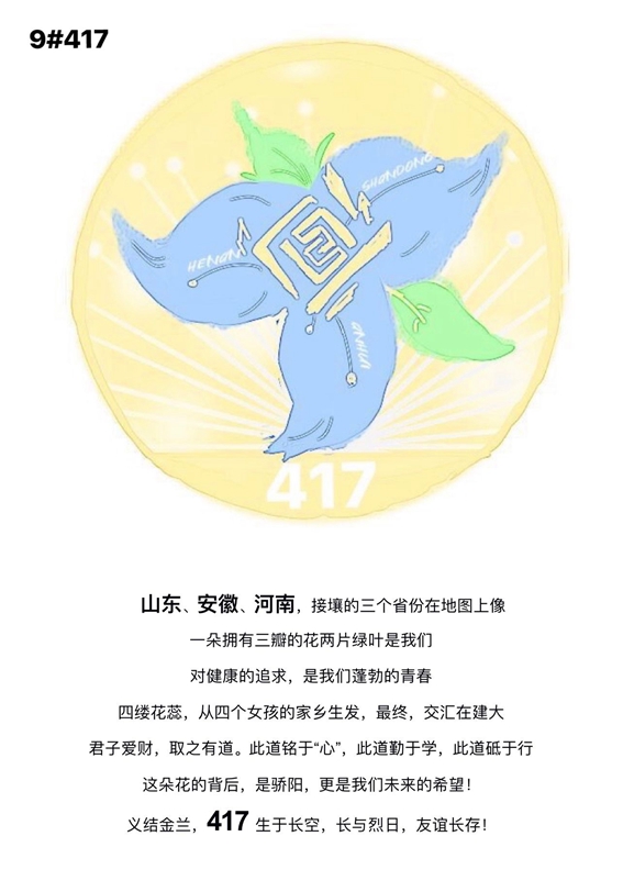 第七个登场的9#417寝室,让在场所有人眼前一亮。山东、河南、安徽是四个人的家乡,也是地图上紧紧相连的三个省份。四位姑娘将三个省份的形状化作一朵兰花,象征着义结金兰,友谊长存。她们从各自的故乡出发,汇聚在安建大美丽的校园,也将在最美的时光中遇见最好的自己。