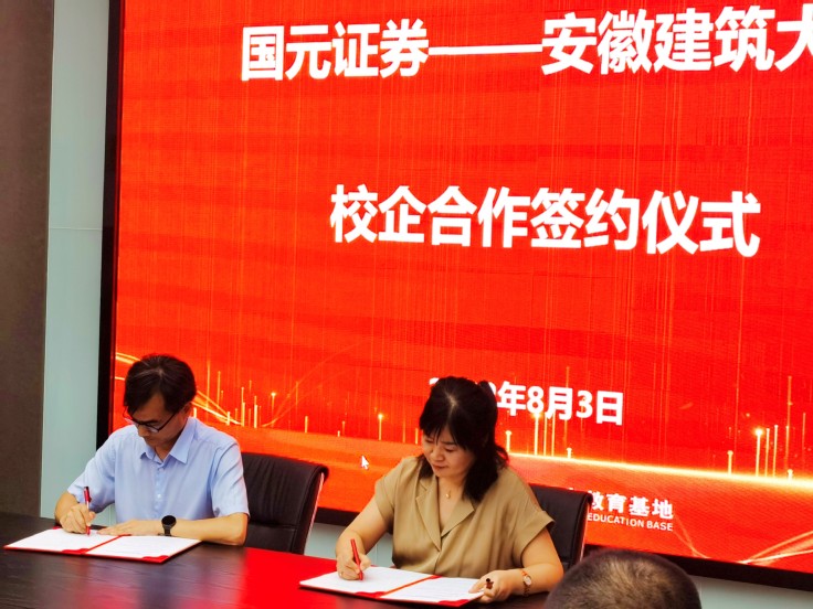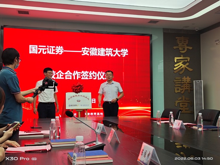 本网讯 8月3日,为提升人才培养质量,深化产教融合、校企合作,经管学院党委书记陈国中率副院长彭志胜、章蓓蓓一行赴国元证券签订协同育人校企合作协议。签约仪式在国元证券投教基地举行,国元证券党委委员、副总裁范圣兵,分支机构服务部总经理许静青,合肥分公司总经理张俊等公司领导参加签约仪式。