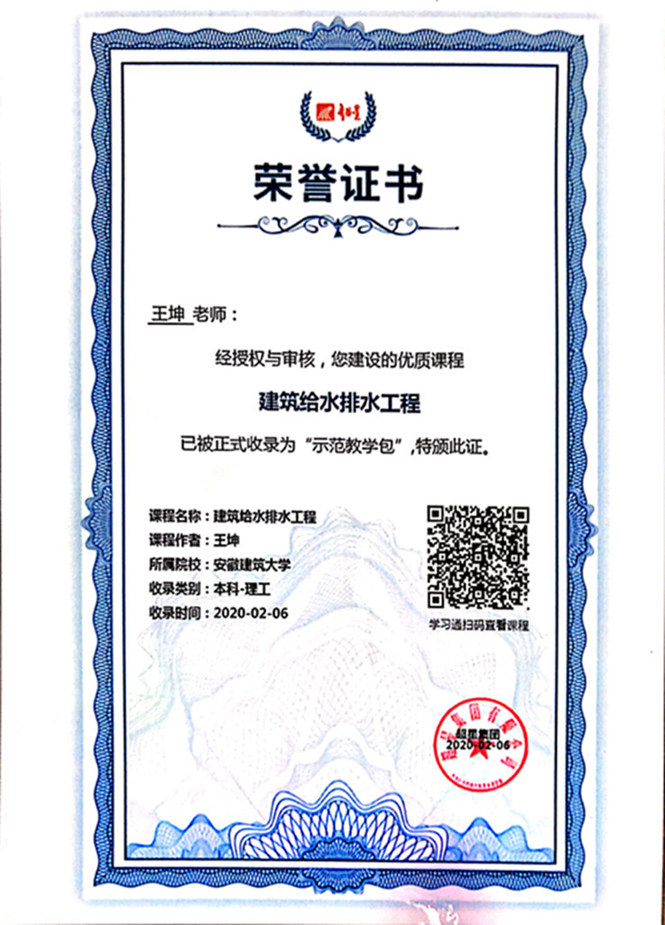 本网讯 近日,我院凌琪老师的《环境保护概论》、王坤老师的《建筑给水排水工程》和潘邦龙老师的《遥感基础与图像处理》三门慕课课程经超星公司专家评审,被收录为超星平台示范教学包,获得超星公司颁发的荣誉证书。