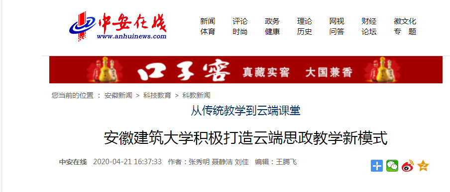 此次特殊时期的“云端”教学开启了该校思政课网络教学的新起点,也是探索线下线上混合教学模式的新契机。安徽建筑大学将继续总结、丰富、完善线上思政课教学,提炼特色,推进“云端思政课”模式常态化,充分发挥好思政课立德树人、铸魂育人的重要阵地作用。(记者 张秀明 聂静洁 通讯员 刘佳)
