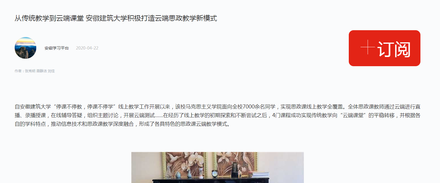 中安在线、中安新闻客户端讯 自安徽建筑大学“停课不停教,停课不停学”线上教学工作开展以来,该校马克思主义学院面向全校7000余名同学,实现思政课线上教学全覆盖。全体思政课教师通过云端进行直播、录播授课,在线辅导答疑,组织主题讨论,开展云端测试……在经历了线上教学的初期探索和不断尝试之后,4门课程成功实现传统教学向“云端课堂”的平稳转移,并根据各自的学科特点,推动信息技术和思政课教学深度融合,形成了各具特色的思政课云端教学模式。