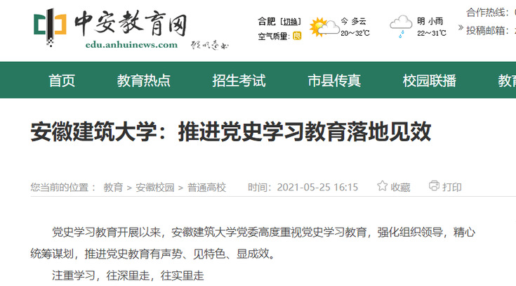 编者按:党史学习教育开展以来,安徽建筑大学党委高度重视党史学习教育,强化组织领导,精心统筹谋划,创新形式开展学习。5月 25日,中安在线对此进行了报道。