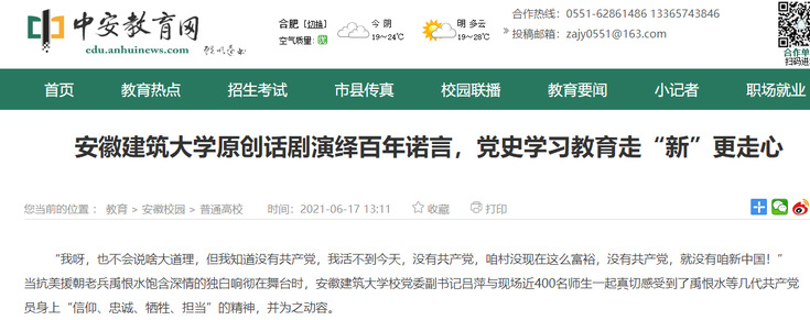 为讲好百年党史的传奇故事,传承红色基因,激发学生们的爱党、爱国之情,充分发挥校园文化在推进大学生党史学习教育中的“精准滴灌”作用,将党史学习教育与落实立德树人根本任务有机结合。安徽建筑大学“兰馨”话剧社历时近8个月编演了话剧《一诺百年》,以抗美援朝老战士禹恨水一家三代,在抗洪救灾、汶川地震、新冠疫情中不忘初心,勇于牺牲,舍小家顾大家为背景。沿着“三代人忠诚守护”的故事主线,在一个多小时的话剧演出中,通过“忠孝两难”“苦盼儿归”“逆行无悔”等一幕幕的动人故事,再现了党和人民解放军坚持以人民的利益为最高利益,践行“为人民服务”诺言的大爱情怀。