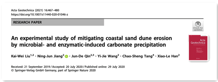 这是刘开伟副教授近年来在《Acta Geotechnica》(JCR Q1区,TOP期刊,影响因子5.736)和《Journal of Building Engineering》(JCR Q1区,影响因子7.144)发表生物碳酸钙在土木工程领域应用研究的高水平论文后的再次突破。