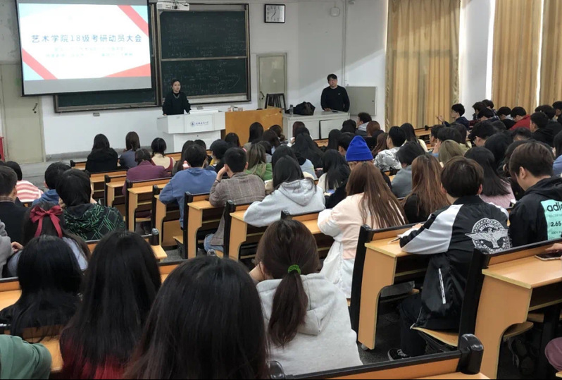 同时为了振奋艺术学院的考研士气,推动学生的考研动力,谷宗州老师还配合艺术学院开展了面向全院学生的考研动员大会,为同学们梳理复习科目的先后顺序、向同学们讲解如何应对考试中的突发情况,帮助同学们了解学科之间的联系以及如何成为一个有独立思考及钻研能力的大学生。并且向同学们普及了近年人数持续增长的考研趋势,以及考研的优势和获取更高学历的好处。谷宗州老师用风趣幽默的语气给同学们讲述了很多考研学生的实例,分享了其中的经验教训,鼓励在场的同学们积极参加考研,为以后的工作、学习奠定良好的基础。