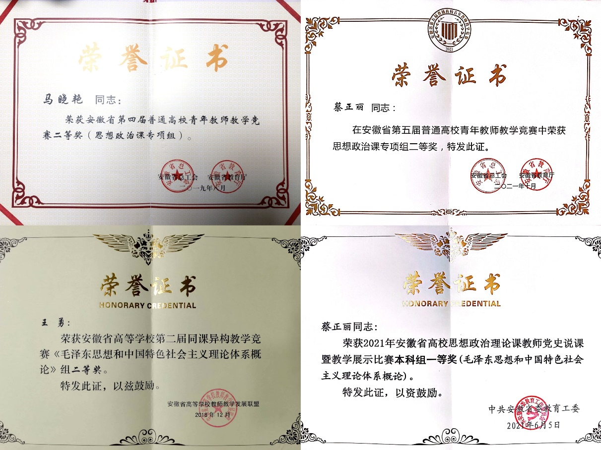 强化教学研究,构建以研促教的教学支撑体系。学院教师围绕“习近平新时代中国特色社会主义思想融入思政课教学”“思政课教学改革创新”“思政课程与课程思政”等方面开展教学研究,及时将研究成果运用于教学工作中,促进教学水平不断提升。学院先后获批教育部思政专项、省级质量工程等项目30余项,获安徽省高等教育教学成果一等奖2项、二等奖、三等奖各1项。1名教师获批省级教学名师,1名教师获省高校思想政治理论课教师度影响力人物,4名教师获省级教坛新秀。获安徽省普通高校青年教师讲课竞赛二等奖、省高校党史说课比赛一等奖、省高校教学创新比赛二等奖等奖项10余项。