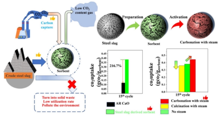 固废源钙基固碳材料制备/再生:大宗钢渣固废较高的钙含量使其成为制备钙基二氧化碳吸附剂的合适前体。本研究对三种不同类型的钢渣进行乙酸浸出并制备钙基吸附剂。采用正交实验确定最有效的酸浸参数,采用蒸汽活化处理缓解钢渣吸附剂在二氧化碳捕获过程中的性能衰退。与试剂级氧化钙相比,钢渣衍生钙基吸附剂具有优越的碳吸收能力。此外,在碳酸化过程中加入蒸汽显示出减缓吸附剂反应活性衰减的潜力。以上成果由学院22级硕士生石秀良以“Optimized acid leaching synthesis and steam regeneration of the steel slag-derived calcium-based sorbent for enhanced CO2capture”为题发表在环境科学领域高水平期刊《Journal of Cleaner Production》(JCR一区,中科院一区TOP期刊,影响因子9.8)。