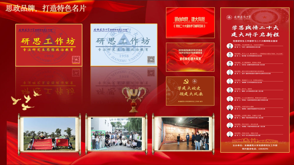 思政品牌,打造特色名片。秉持“思政赋能、特色铸品、协同育人”理念,深挖专业资源,打造“研心向党,建大有我”思政品牌矩阵。持续推进“研思工作坊”建设,本年度,推送“研心向党,党的二十大报告学习辅导百问”20期,“研工头条”19期。搭建实践课堂,强化学用结合,开展“行走的思政课” “传统文化的思政课” “校史馆里的思政课”等品牌思想文化活动。紧扣时代脉搏,充分挖掘学院学科专业特色和资源禀赋,打造研究生思想政治教育与管理“一院一品”活动创建工作。