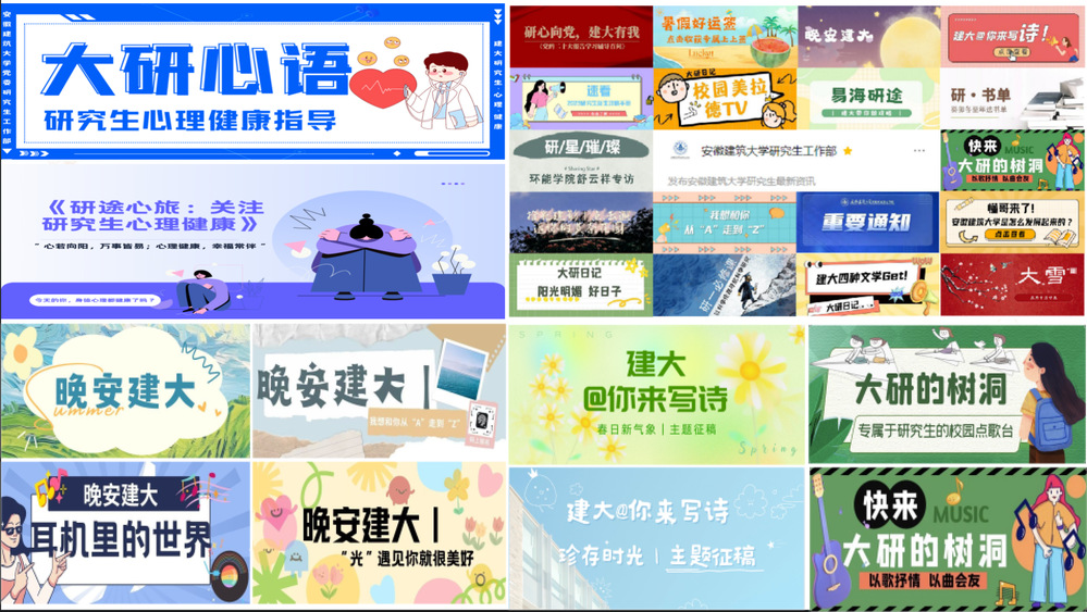 心理健康,守护心灵晴空。搭建“大研心语”平台,助力研究生心理健康教育。依托“晚安建大”“建大@你来写诗”“大研的树洞”栏目,开展积极心理学活动,将阅读、健身、观影、赏乐融入心理健康活动,常态化开展普及性活动20期,覆盖全校研究生。