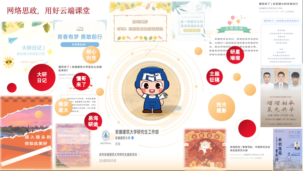 网络思政,用好云端课堂。依托“安徽建筑大学研究生工作部”微信公众号平台,加强研究生网络思政宣传,打造研究生良好的公众形象,营造积极向上,健康的网络阵地。2024年平台建设,聚焦功能拓展提质,力促体验优化增效。在内容建设上,打造“大研日记”“拾光建影” “易海研途” “懂哥来了”等特色栏目;强调用户体验,推动“你好建大研,权益篇”等实用信息;聚焦先进典型人物,推出“荣耀建大”“研星璀璨”系列推文,充分发挥激励引导作用。本年度,研究生新媒体平台粉丝量超8600人,年度推文量200余篇,浏览量近10万人次。