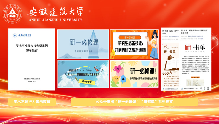 日常管理,规范行为养成。编印《安徽建筑大学研究生安全手册》,开展研究生工作室安全督查,多渠道多角度引导研究生树立安全意识。以学术诚信教育为核心指引,开展“学术不端行为与典型案例警示教育”活动;持续推行“新生导航计划”,开展“研一必修课”9期以及“研·书单”3期。