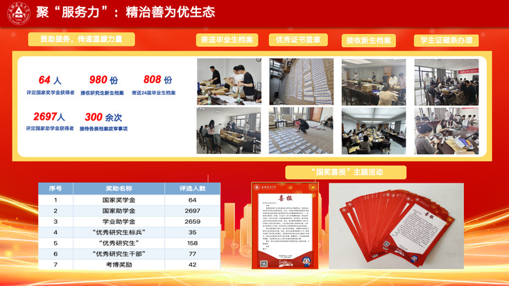 资助服务,传递温暖力量。评定研究生国家奖学金获得者64人、学业奖学金获得者2659人、国家助学金获得者2697人,“优秀研究生”158人,“优秀研究生干部”77人,“优秀研究生标兵”35人。完成808份毕业生及980份新生研究生档案寄送与接收工作;按时完成学校教育统计数据;接待各类档案政审事项300余次;关心关爱联培研究生,认真做好“五特”群体研究生的帮扶工作。