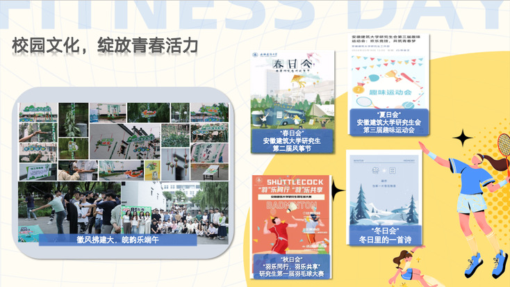 校园文化,绽放青春活力。将徽文化与端午传统文化相融合,紫云路校区徽州建筑区举办“徽风拂建大,皖韵乐端午”端午节文化体验活动。打造“研工时节”品牌文化活动,举办“春日会”——安建大研究生第二届风筝节;“夏日会”——安徽建筑大学研究生会第三届趣味运动会;“秋日会”——“羽乐同行,羽乐共享”研究生第一届羽毛球大赛;“冬日会”——冬日里的一首诗。