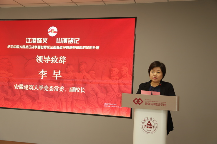 本网讯 近日,“江淮烽火 山河铭记——纪念中国人民抗日战争暨世界反法西斯战争胜利80周年档案图片展”,在安徽建筑大学紫云路校区徽韵楼二楼展厅正式启幕。安徽省文联副主席许国,校党委常委、副校长李早,校党委常委、宣传部部长徐庚阳等出席仪式,建筑与规划学院党政领导班子、2025级新生共同到场,见证展览开启。现场氛围庄重,展厅入口处的主题背景板以红色为主色调,印刻展览名称与抗战历史元素,吸引参会者驻足。