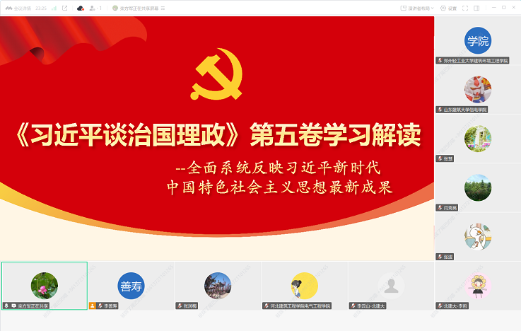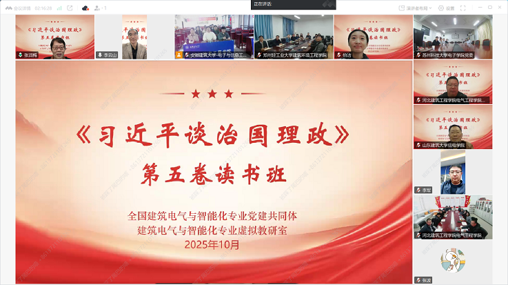 本网讯 为深入学习贯彻习近平新时代中国特色社会主义思想,推动师生党员在深学细悟笃行、深化内化转化上下功夫,切实把学习成果转化为推动事业发展的实际成效。10月20日下午,全国建筑电气与智能化专业党建共同体通过建筑电气与智能化专业虚拟教研室平台成功举办专题学习《习近平谈治国理政》第五卷读书班。来自共同体成员单位的党委(总支)负责人、支部书记及师生党员近300人参加。