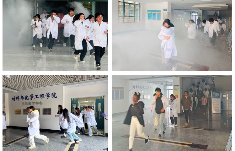 随着总指挥宣布演练正式开始,演练师生迅速抵达预定实验室。各楼层安全员逐一报告准备就绪,随即烟雾发生器启动,警报声响起,各实验室师生迅速停止实验操作,关闭电源、气源、水源,在安全员的引导下,按照预定疏散路线,弯腰低姿、捂住口鼻,快速有序地向指定安全区域撤离。疏散过程中,师生严格遵守疏散纪律,不推挤、不慌乱,保持安全间距。