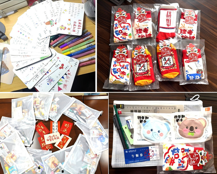 学院毕业班辅导员们化身“暖心护航员”,以专业班级为单位逐一召开考研温馨提示与祝福主题班会。辅导员们结合历年考研实战经验,细致拆解考试流程、证件物品准备、考场注意事项等关键细节,针对学子们关心的答题技巧、心态调节等问题逐一答疑解惑;同时,主动倾听学子备考中的压力与困惑,用真诚的交流与贴心的疏导为大家 “减压赋能”。班会尾声,辅导员为每位考研学子送上定制暖心礼包——礼包内不仅有提神饮品、考试专用文具、保暖贴等实用好物,更附有辅导员手写的个性化祝福便签,一句句“全力以赴,未来可期”“落笔生花,金榜题名”的暖心话语,将细致关怀藏进方寸之间,让学子们切实感受到“亦师亦友”的温暖陪伴。