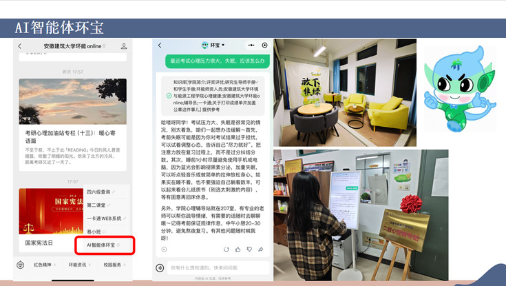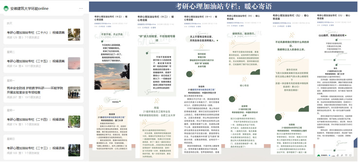 学院团委新媒体中心与二级心理辅导站联手打造考研专属线上陪伴平台,历时数月持续推出26期考研主题推文与短视频。内容兼具实用性与治愈感。既有针对公共课、专业课的冲刺技巧梳理、错题复盘方法分享,也有心理调适小妙招、考前焦虑缓解指南;有邀请往届高分学长学姐分享备考心路与应试经验,也有温情文字送上每日鼓励,用“加油语录”“备考小贴士”“冲刺微视频”为学子打气。同时,引入AI智能体“环宝”,依托学院专业特色与情感计算技术,为学子提供7×24小时心理疏导与个性化支持,成为学子备考路上的“心灵伙伴”。