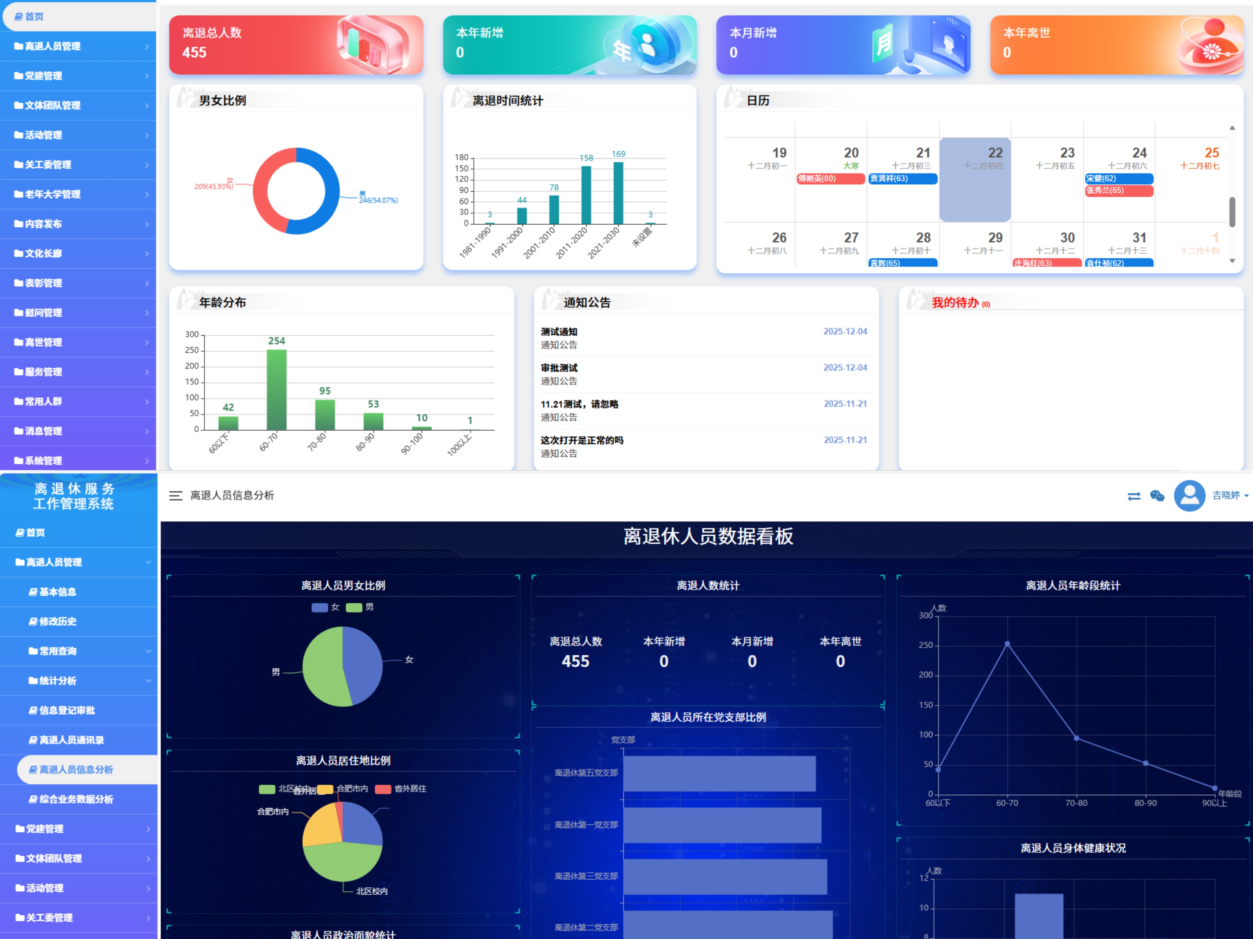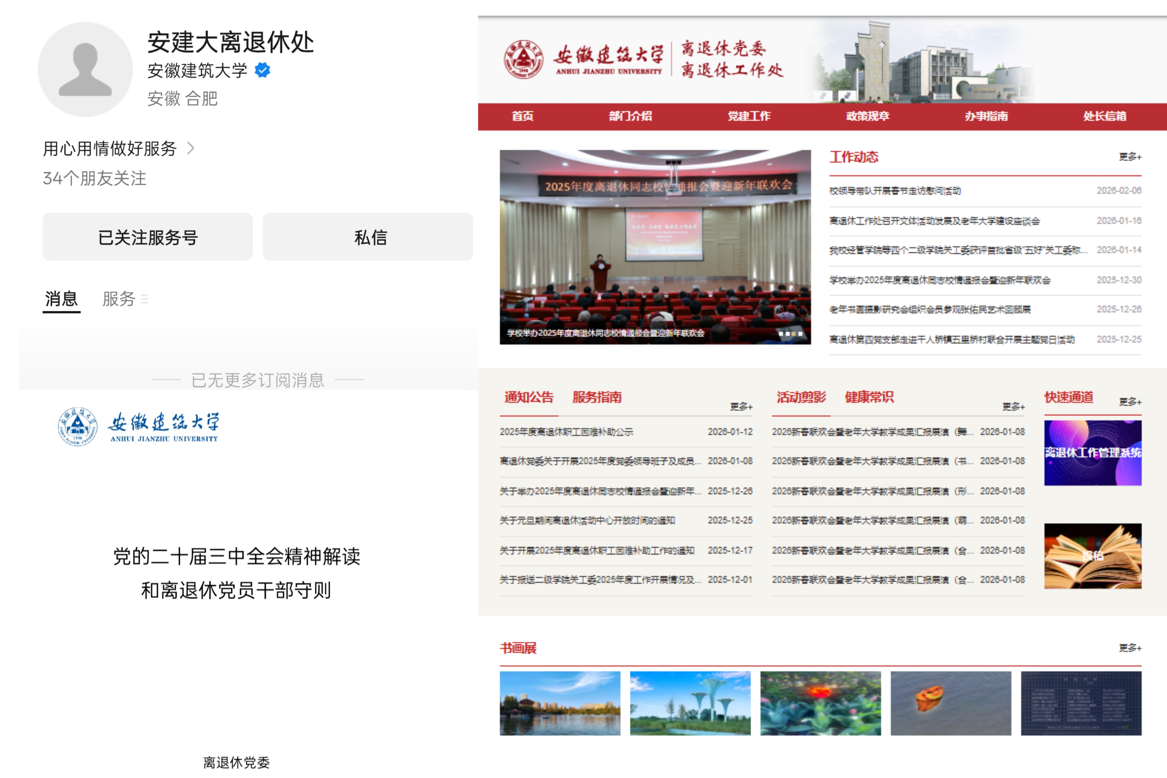 持续加强自身建设,推动工作提质增效。夯实党建根基,规范支部建设,编印《离退休党员干部守则》并发放至全体老同志,作为党支部理论学习、主题党日活动的核心学习材料,有效强化行为规范与自我管理。支部建设取得突破,第一党支部顺利通过“双创”样板党支部达标验收,第四党支部积极参评省委老干部局“全省示范党支部”,示范培育工作扎实推进,引领力持续增强。拓展宣传阵地,打造网上家园,全面推广“建大离退休”服务号,年均发布新闻26篇,及时报道校情通报会、联欢会、主题党日、文体活动及关工委获奖等重要动态,其中党建主题活动、敬老慰问、老年大学建设等特色工作在省教育厅、省委老干部局网站及《新安晚报》等媒体报道19篇,信息渠道显著拓宽,老同志联系更加紧密。优化网站功能,设置“服务指南”“活动剪影”“健康常识”等专栏,将办事窗口升级为有温度的“网上家园”。深化信息赋能,提升服务精度,离退休信息管理系统完成验收并正式投用,实现人员信息管理、活动组织、政策查询等多功能一体化集成,工作效率与管理服务精准度显著提升。