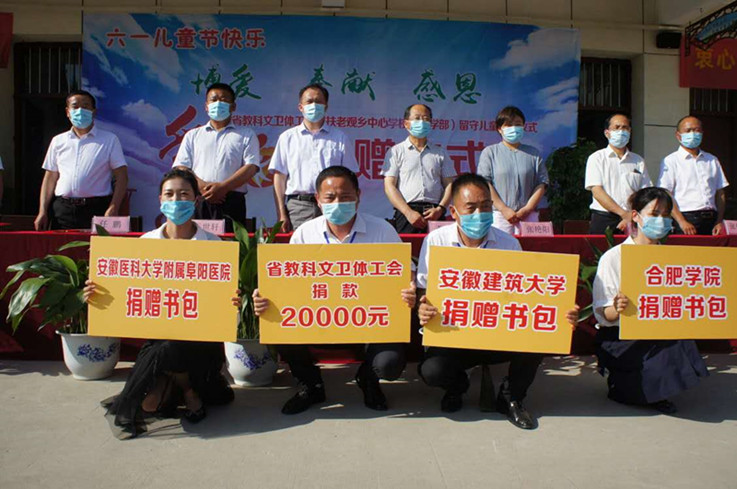 本次捐赠是安徽省教科文卫体工会联合安徽建筑大学、合肥学院、安徽医科大学附属阜阳医院等单位对老观乡中心学校(小学部)留守儿童进行爱心捐赠。其中安徽省教科文卫体工会捐款2万元,安徽建筑大学、合肥学院、安徽医科大学附属阜阳医院为留守儿童共捐赠书包420个。