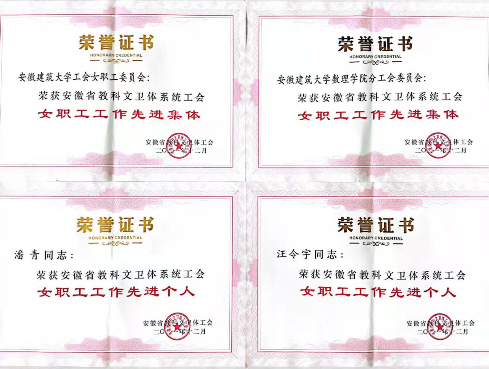 本网讯 12月14日,安徽省教科文卫体工会印发《关于选树安徽省教科文卫体系统工会女职工工作先进集体、先进个人的通报》,我校工会女职工委员会、数理学院分工会荣获“安徽省教科文卫体系统工会女职工工作先进集体”荣誉称号,外国语学院汪令宇、艺术学院潘青荣获“安徽省教科文卫体系统工会女职工工作先进个人”荣誉称号。