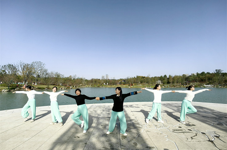 大家漫步在林荫路上,纷纷扬起手中的长扇,在湖边翩翩起舞,她们的幸福笑容,美丽身姿,为安徽园再添一道美丽的风景。