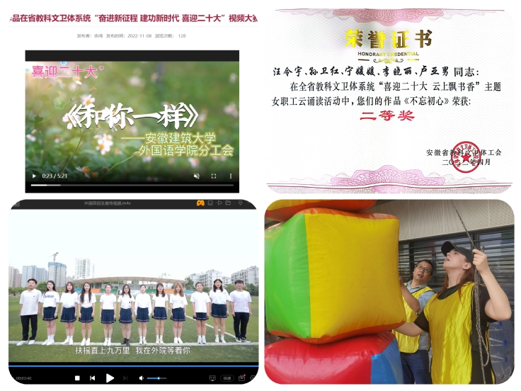 近年来,在学校党委行政的坚强领导下,在校工会的大力支持下,外国语学院分工会通过加强自身建设,凝聚学院力量,提高自身实力,先后获得安徽省三八红旗手1名、省教科文卫体工会女工工作先进个人1名、校提案工作先进单位、校工会工作先进集体、校模范职工小家、省系统工会心灵驿站等荣誉称号。分工会注重在日常工作中积极发挥维护、建设、参与、教育职能,在营造凝聚向上的工作氛围,带领全体教职工立足岗位、建功立业方面发挥了重要作用。