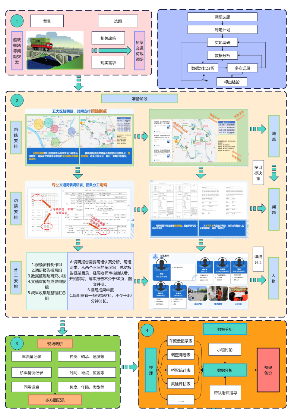 团队聚焦桥梁交通荷载与实际安全状况,带着“摸清现状、服务民生”的目标,制定了科学细致的调研方案。每座桥梁的调研都严格遵循标准化流程,队员们分工明确,相互配合。