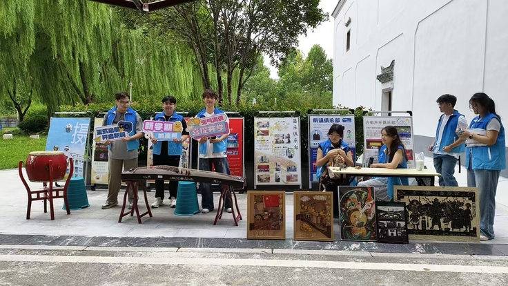 本网讯2025年9月10日,安徽建筑大学举办迎新活动。公共艺术教育俱乐部积极参与,在光启堂外搭建展位,设置了多个互动区域,包括非遗作品展示、合唱互动和乐器体验等。