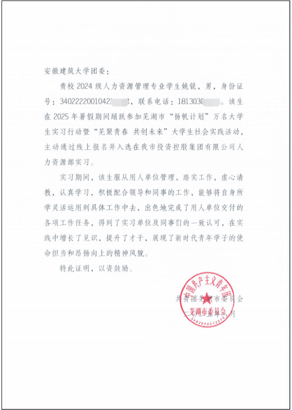 近日,学校收到共青团芜湖市委员会发来的表扬信,对公管学院2024级人力资源管理专业学生姚锐,在“扬帆计划”实习实践活动中的出色表现给予高度认可与赞扬。