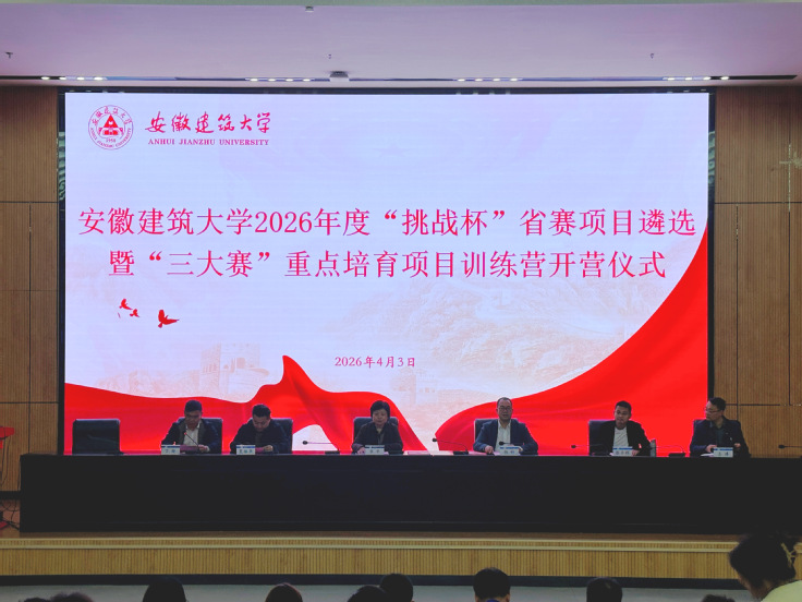 本网讯 4月3日上午,学校2026年度“挑战杯”省赛项目遴选暨“三大赛”重点培育项目训练营开营仪式在紫云路校区徽风楼2楼报告厅举行。校党委副书记李早,校党委常委、副校长杨科出席仪式,科创领域专家、本科生院(创新创业学院)负责人、各学院学科竞赛与团委负责人、入营项目指导教师及团队负责人参加活动。仪式由校团委书记丁超主持。