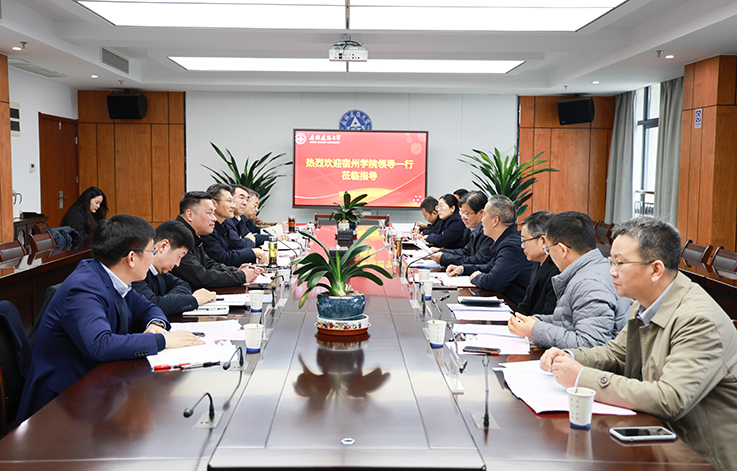 本网讯 12月22日,宿州学院党委书记李红,党委副书记、校长闵杰,党委常委、副校长杨维志,副校长陈得宝一行9人来校调研交流。学校在紫云路校区徽风楼21楼第五会议室召开座谈会,党委书记马文革主持会议,党委副书记、校长蔡国军出席会议,办公室、发规处、人事处、本科生院、科技处、科技成果转化处等单位主要负责人参加会议。