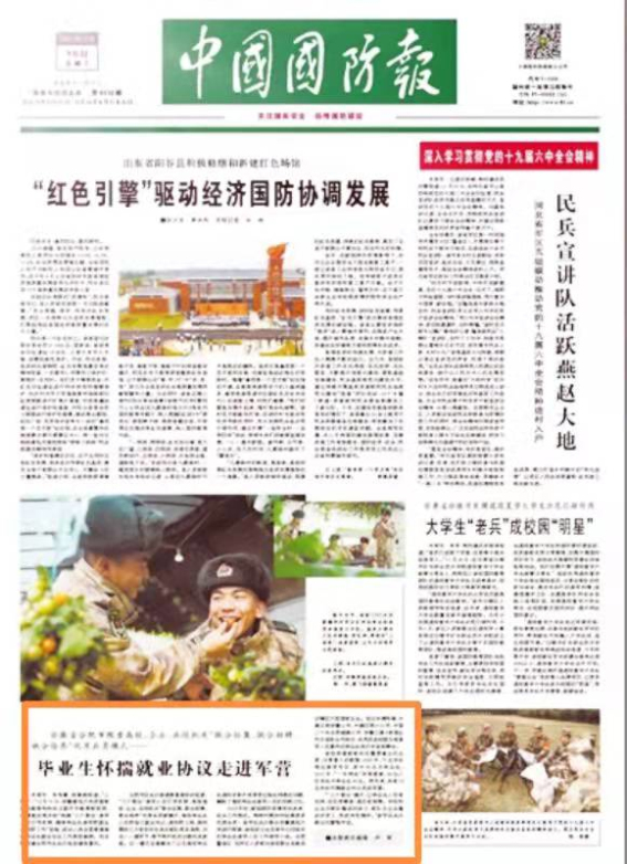 本网讯 2021年12月15日《中国国防报》头版刊发《安徽省合肥市探索高校、企业、兵役机关“联合征集、联合招聘、联合培养”优质兵员模式---毕业生怀揣就业协议走进军营》,详细介绍安徽建筑大学以“三个联合”助推征兵工作。