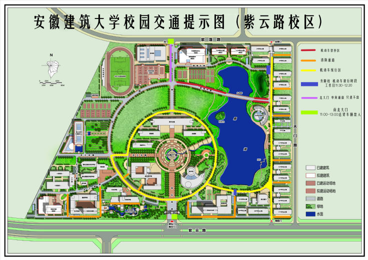 根据南校区交通道路环境实际,在人员密集区域设立机动车禁行禁停区,结合校园高峰期拥堵的情况,在部分路段设置禁行缓行路段。