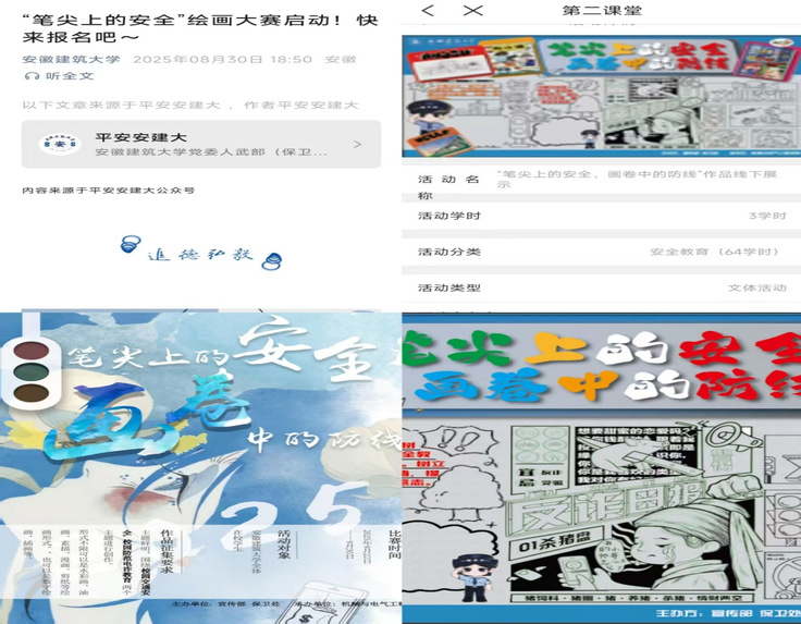 为深入推进平安校园、和谐校园建设,创新安全教育形式,提升师生安全防范意识与自我保护能力,由党委宣传部、保卫处、机电学院、校团委联合举办了安徽建筑大学首届“笔尖上的安全,画卷中的防线”主题绘画大赛。此次活动以绘画大赛为契机、以多平台支持为动力、以“警校联动”为特色,用寓教于乐的方式,将艺术创作与安全教育深度融合,在全校范围内掀起了一股“学安全、懂安全、绘安全”的热潮,获得了师生的高度肯定与广泛好评。