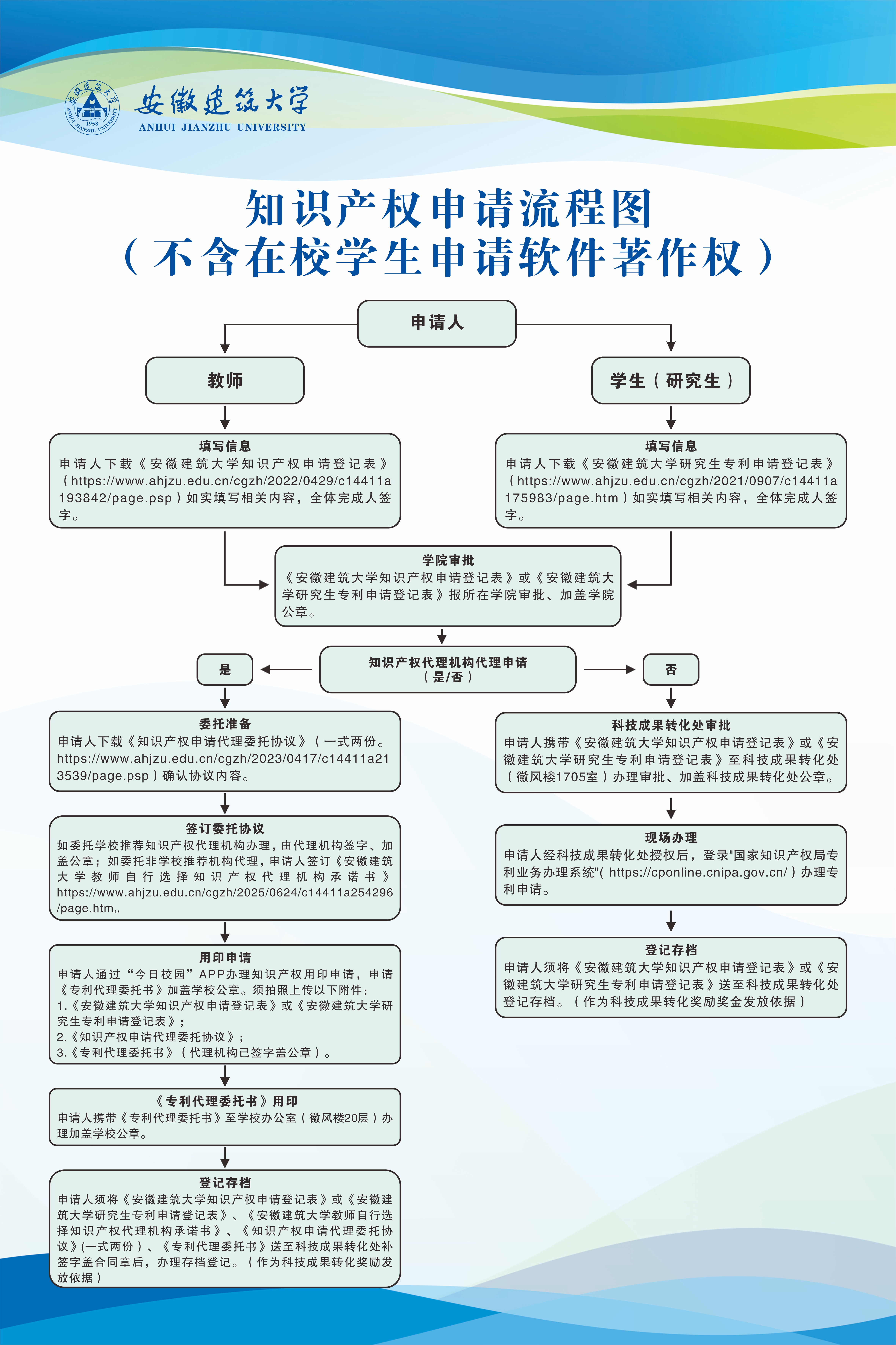 为将学校“高效办成一件事”的要求落到实处,真研究问题,真解决问题,科技成果转化处优化知识产权申请审批程序,实行网上“一站式”审批,具体见附件流程图,原安徽建筑大学知识产权申请登记表已更新。见附件2。同时,全面开展送服务到基层活动,持续优化服务质量、提升工作效能,推动科技成果转化实现产业化突破。