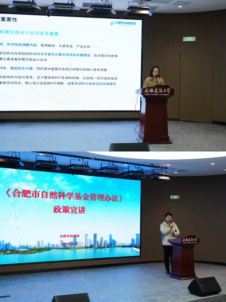 活动现场,举行了合肥科创技术经理人实践基地揭牌仪式和合肥市科创集团技术经理人聘请仪式。在政策宣讲及转化培训环节,相关负责人详细解读了合肥市自然科学基金政策,并针对早期项目商业计划书撰写与路演要点开展专项培训,为在场科研团队、创业项目送上精准政策指引与实践启发。设计创意学院钟新老师分享了成果转化创业经验。