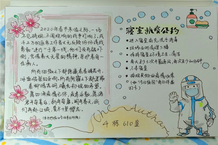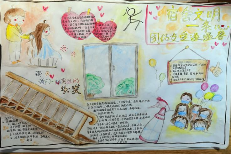 本网讯 为营造健康向上、文明和谐的宿舍环境,4月10日,材化学院举办了以“宿舍文明一条心,团结友爱溢温馨”为主题的手抄报评比活动。
