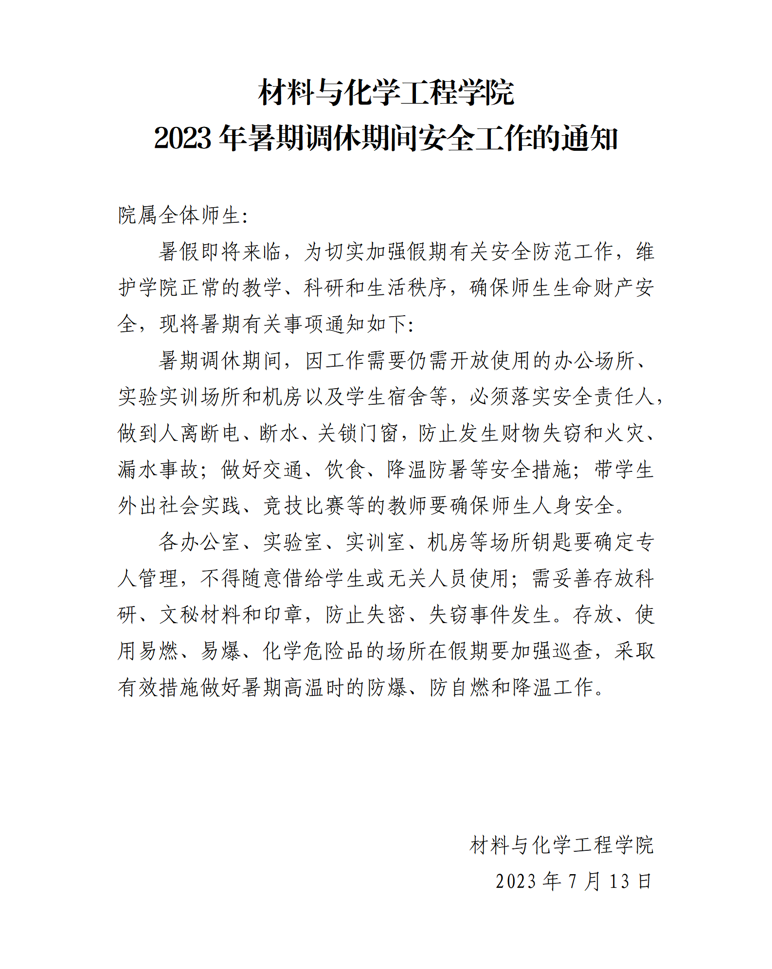 材料与化学工程学院 2023年暑期调休期间安全工作的通知