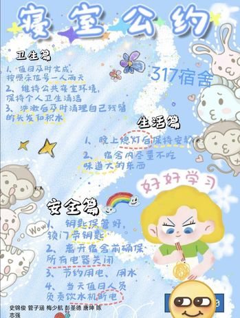 活动启动以来,同学们围绕作息规范、卫生维护、互助协作、文明交流等核心议题,结合寝室实际生活场景,设计出兼具实用性与趣味性的公约内容。有的寝室以“早睡早起不熬夜,课堂精神倍儿好”“垃圾日产不堆积,窗明几净心舒畅”等朗朗上口的短句凝聚共识;有的则加入“互助学习小组”“轮流值日责任制”等具体机制,让公约落地见效;部分寝室还融入环保理念与兴趣特色,将“节约水电随手关”“安静氛围共守护”等要求转化为生动的图文海报。