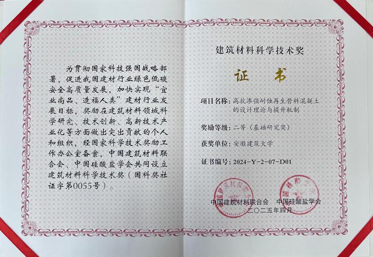 本网讯 2025123日,2025建筑材料行业科技创新大会在浙江宁波举行会上颁发了2024年度建筑材料科学技术奖。由安徽建筑大学作为第一完成单位,东南大学、江苏苏博特新材料股份有限公司参与完成,刘开伟、鲁聪、李贞、张士萍、刘诚、王爱国、汤金辉、孙道胜为主要完成人的高抗渗强耐蚀再生骨料混凝土的设计理论与提升机制项目,荣获基础研究二等奖。
