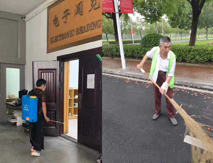 暑假期间,学校里仍有3000余学生留校学习,为做好留校师生的物业保障服务,物业员工全部坚守岗位,在烈日的烤灼下,每天对校园全部公共区域进行清扫、消杀,沉重的消毒箱,压弯了腰,滴滴汗水浸湿了衣衫。