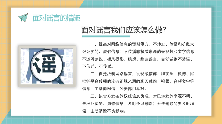 四位同学分别制作了画面精美、内容详实的PPT,再由学院辅导员转发至各班共同观看学习。18通信工程专业的赵琦以《抵制网络谣言 防范网络诈骗》为题,向同学们明晰了网络诈骗的定义、危害与处罚方式,她认为,在疫情防控期间,面对线上线下纷繁复杂的信息,更要提高甄别能力,以官方发布的权威信息为准,不信谣,不传谣,科学防骗。18建筑电气与智能化专业崔立鹏和17电子信息工程专业李备两位同学,则专注于向同学们传达如何提高疫情期间生活质量的方法,长期居家或可能导致作息时间失调等现象,通过调整饮食方式、进行必要的居家运动等与“失眠君”友好分手,学会洗手和勤于洗手也是防控疫情传播的有效方式。17电子信息工程专业的薛永强作为上一年的国家奖学金获得者,他将自身居家学习的经验同大家共享,如为自己创造一个类似“教室”的学习环境,模仿在校期间的生活作息,给予自己积极的心理暗示等等。
