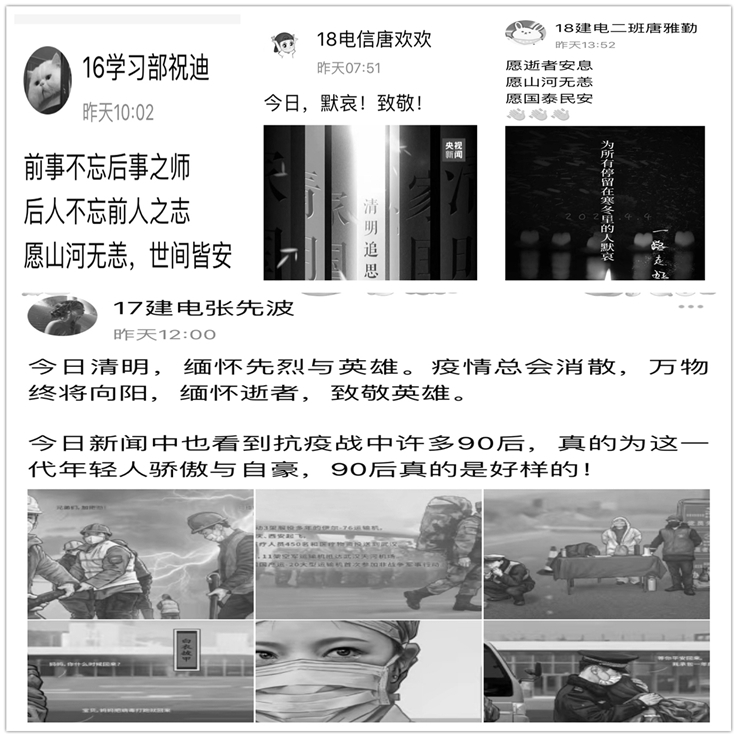 本网讯 为表达全国各族人民对抗击新冠肺炎疫情斗争牺牲烈士和逝世同胞的深切哀悼,4月4日,全国上下开展全民哀悼,缅怀英雄。电信学院学子也怀着崇敬和沉痛的心情,自发向以身殉职的抗疫英雄和不幸遇难的同胞表示追思与哀悼。
