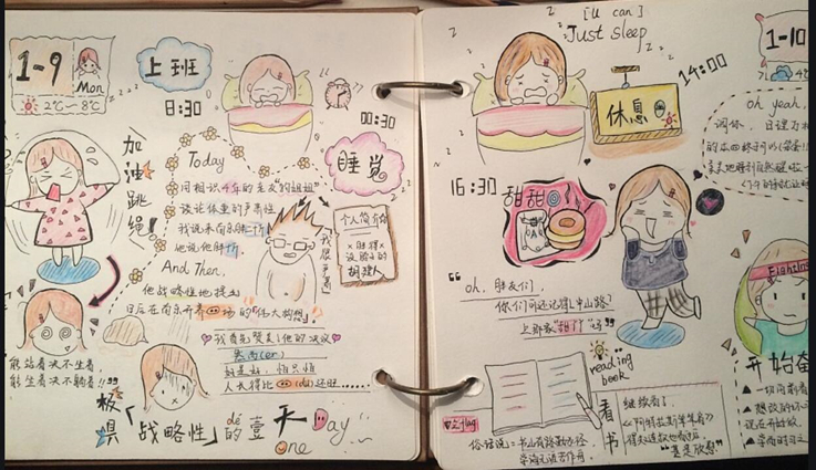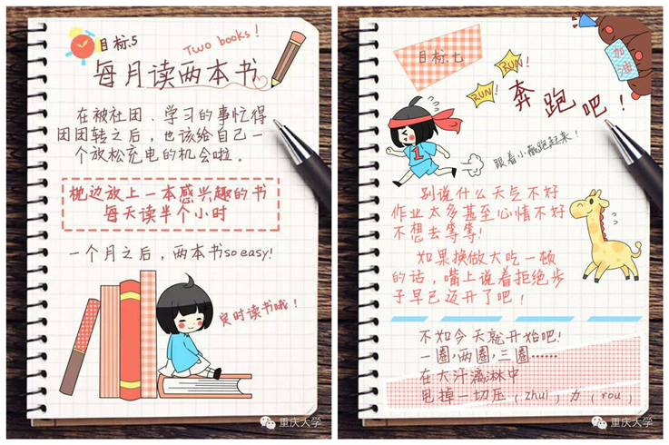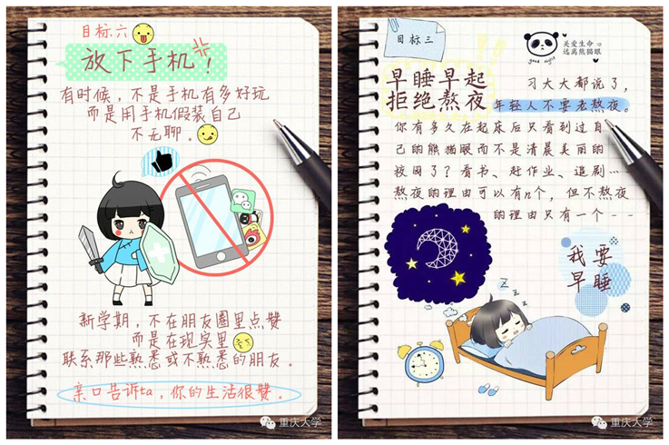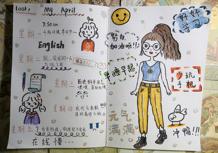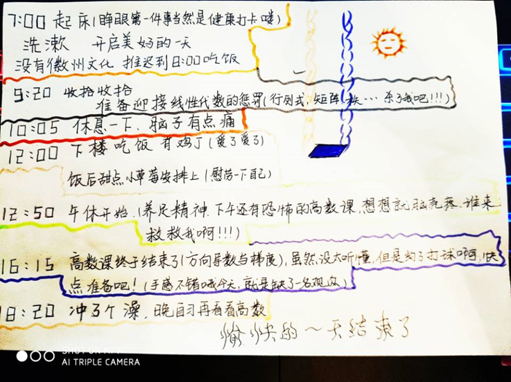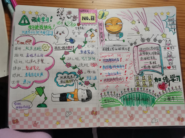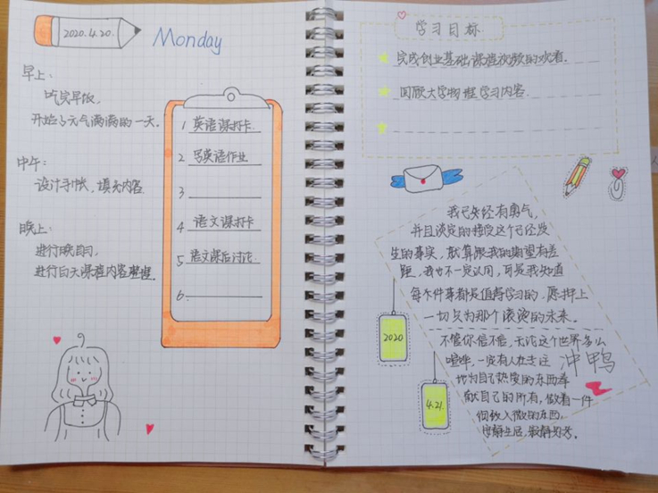 针对同学们反馈的问题,部分学习优秀的同学代表向大家讲述了自己的居家学习经验,制作并上传了自己的居家生活手账。手账画面精美,内容更是充实且有操作性,制作者们希望通过这样“有趣”的方式,带领其他同学共建良好学风,保持如同在校般的高效学习。