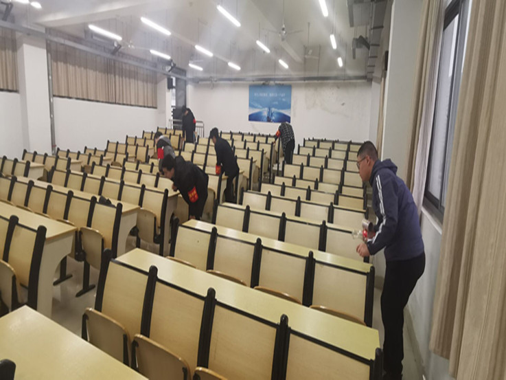 教室是学生掌握知识、培养品格、开启人生的地方,第三支学生干部志愿队伍来到逸夫楼,对教室进行清扫。同学们带着各种工具赶到教室迅速投入战斗,为避免打扰还在教室自习的同学,他们以最快的速度将教室里的纸屑灰尘等清扫干净。快速的行动虽然让大家出了一身汗,但内心的满足却无法用言语表达。