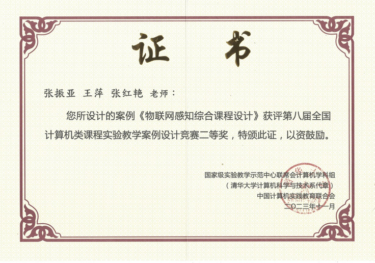 本网讯 11月3日—11月5日,第七届中国计算机实践教育学术会议暨第十六届全国高等学校计算机实践教学论坛(CCPEC2023)在福州举行。会议期间举行了“第八届全国计算机类课程实验教学案例设计竞赛”颁奖典礼,我校电子与信息工程学院教师张振亚、王萍、张红艳联合完成的计算机实验教学案列《物联网感知综合课程设计》获评第八届全国计算机类课程实验教学案例设计竞赛二等奖。